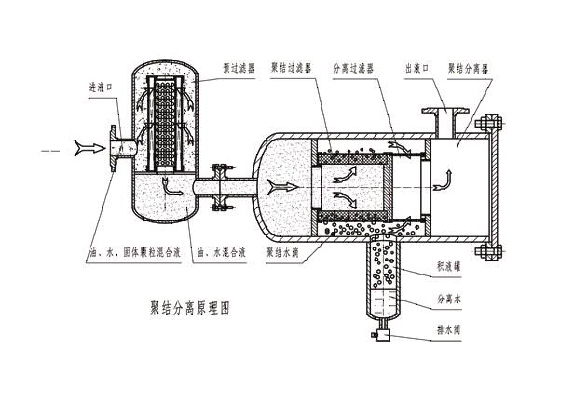 分離系統(tǒng)的分離濾芯由特殊的疏水材料制成,油液通過濾芯時,水珠被擋在濾芯的外表面,相互聚結(jié)直至因重力作用,沉降至儲水罐內(nèi)。